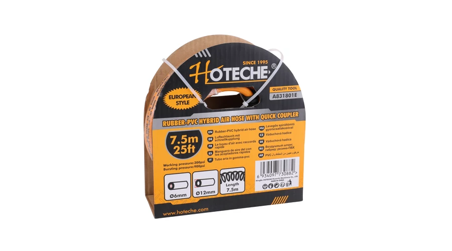 Fleksibilno crevo za vazduh Hoteche dimenzija 6×12 mm i dužine 10 m idealno je za upotrebu sa kompresorima i pneumatskim alatima. Namenjeno je za brzo, efikasno i sigurno transportovanje komprimovanog vazduha od kompresora do alata, pištolja ili priključaka.